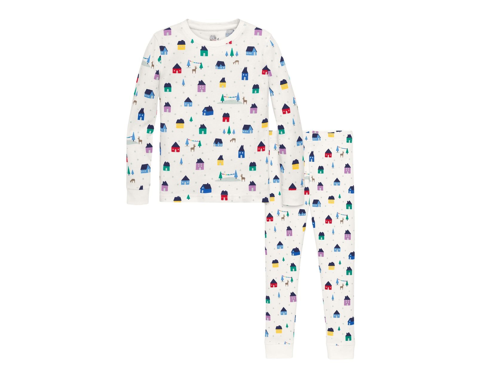 Get your little one ready for festive fun with this Holiday PJ Set, perfect for cozy nights and holiday celebrations! Made from 100% GOTS certified organic cotton interlock, this cloud-like PJ set includes a long sleeve shirt and a pair of pants which are incredibly soft, naturally stretchy, and kind on the skin! The PJ set is pre-washed to minimize shrinkage and features a playful rainbow winter village pattern!